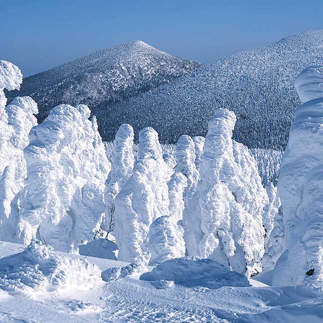 ทุ่งปิศาจน้ำแข็งที่ภูเขาซาโอะ (Frost Covered Trees) ใครที่ชอบหิมะ ชอบอากาศหนาวๆไม่ควรพลาดไปเที่ยวที่นี่นะคะ เป็นป่าสนที่อยู่บนภูเขาซึ่งถูกเกล็ดน้ำแข็งปกคลุมจนเป็นสีขาวโพลนทั้งหมดจนมีลักษณะคล้ายกับไอซ์มอนสเตอร์ นักท่องเที่ยวสามารถเดินชมไปตามแนวป่าสน หรือสามารถนั่งกระเช้าเพื่อชมความมหัศจรรย์ของป่าสนได้จากด้านบนค่ะ และตอนกลางคืนก็ยังมีการไลท์อัพ (การฉายไฟ) เราก็จะได้เห็นไอซ์มอนสเตอร์ในมุมมองที่แปลกไปอีกค่ะ นอกจากนี้ ภูเขาซาโอะก็ยังเป็นที่นิยมในการเล่นสกี และยังมีซาโอะออนเซ็น ที่มีประสิทธิภาพในการช่วยรักษาโรค เช่น ปวดเส้นประสาท ปวดกล้ามเนื้อ ผ่อนคลายจากความเหนื่อยล้า ปวดไหล่ บวมช้ำ โรคระบบทางเดินอาหารเรื้อรัง แผลเปิด แผลไฟไหม้ /ไฟลวก/น้ำร้อนลวก โรคผิวหนังเรื้อรัง โรคเบาหวาน โรคความดันสูง โรคเส้นเลือดตีบ โรคริดสีดวงทวารต่างๆ และยังช่วยให้ผิวสวยอีกด้วยค่ะ